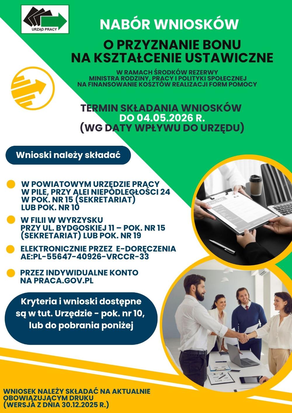 ZAPRASZAMY osoby bezrobotne i poszukujące pracy do składania wniosków o przyznanie bonu na kształcenie ustawiczne (do dn. 04.05.2026 r.) - Powiatowy Urząd Pracy w Pile