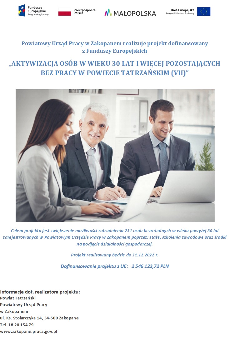 „Aktywizacja osób w wieku 30 lat i więcej pozostających bez pracy w powiecie tatrzańskim (VII)" realizowanego