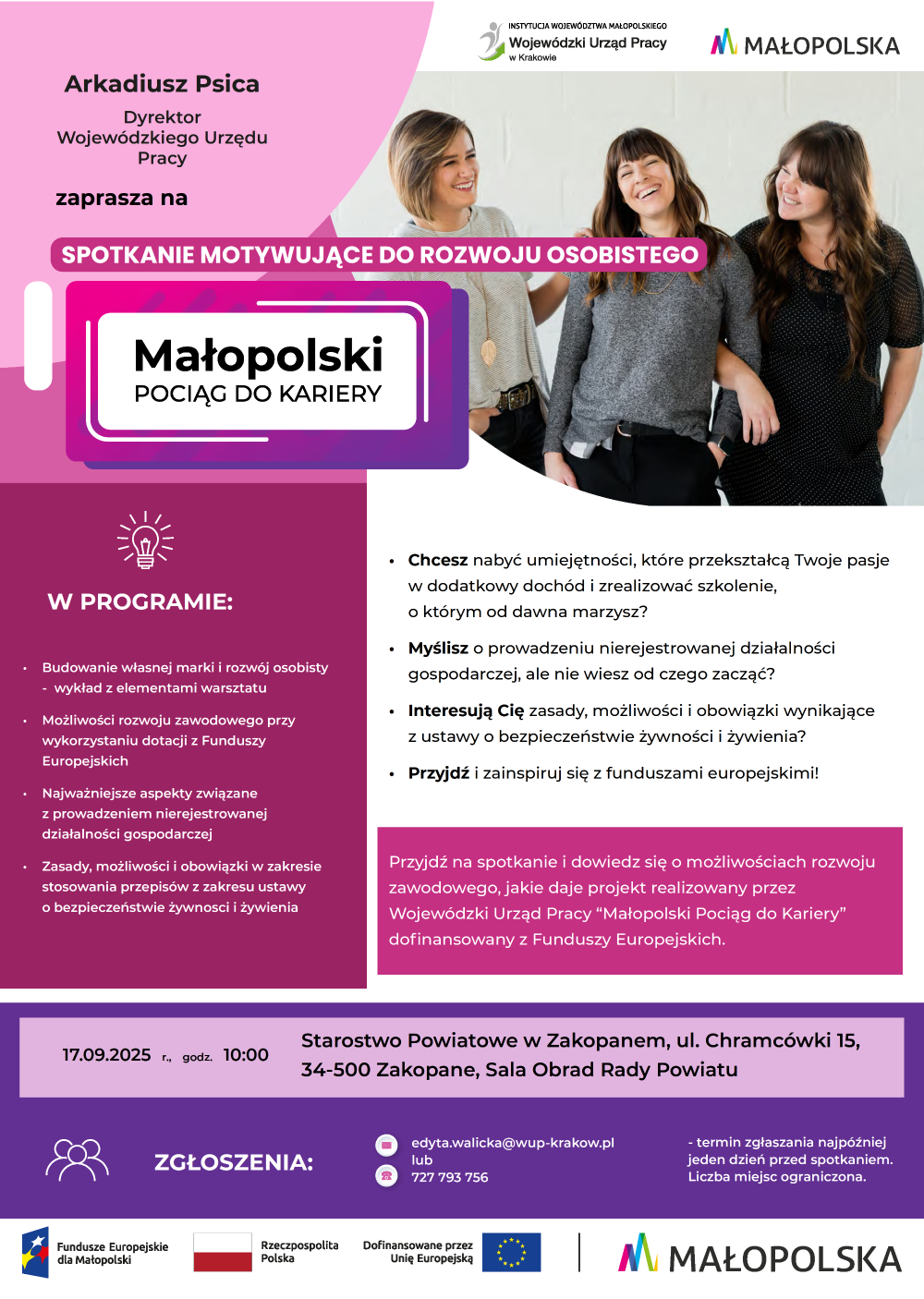 ✨ @Wojewódzki Urząd Pracy w Krakowie, instytucja Województwa Małopolskiego już w we wrześniu zaprasza mieszkańców Małopolski na kolejną edycję spotkań motywujących do rozwoju osobistego.